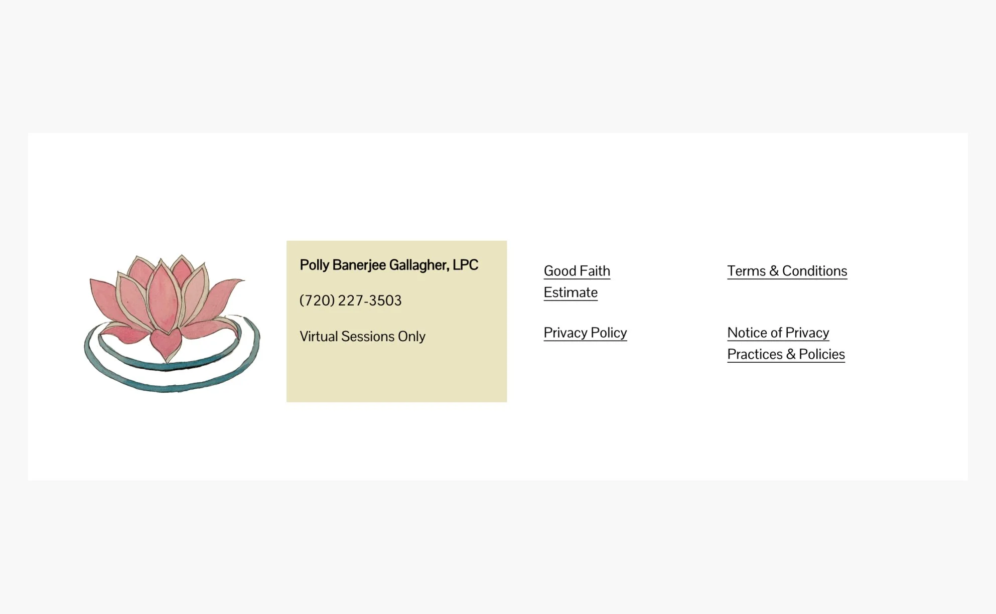 Polly Banerjee, a licensed professional counselor specializing in contemplative psychotherapy and chronic pain management, needed a professional online presence that would: